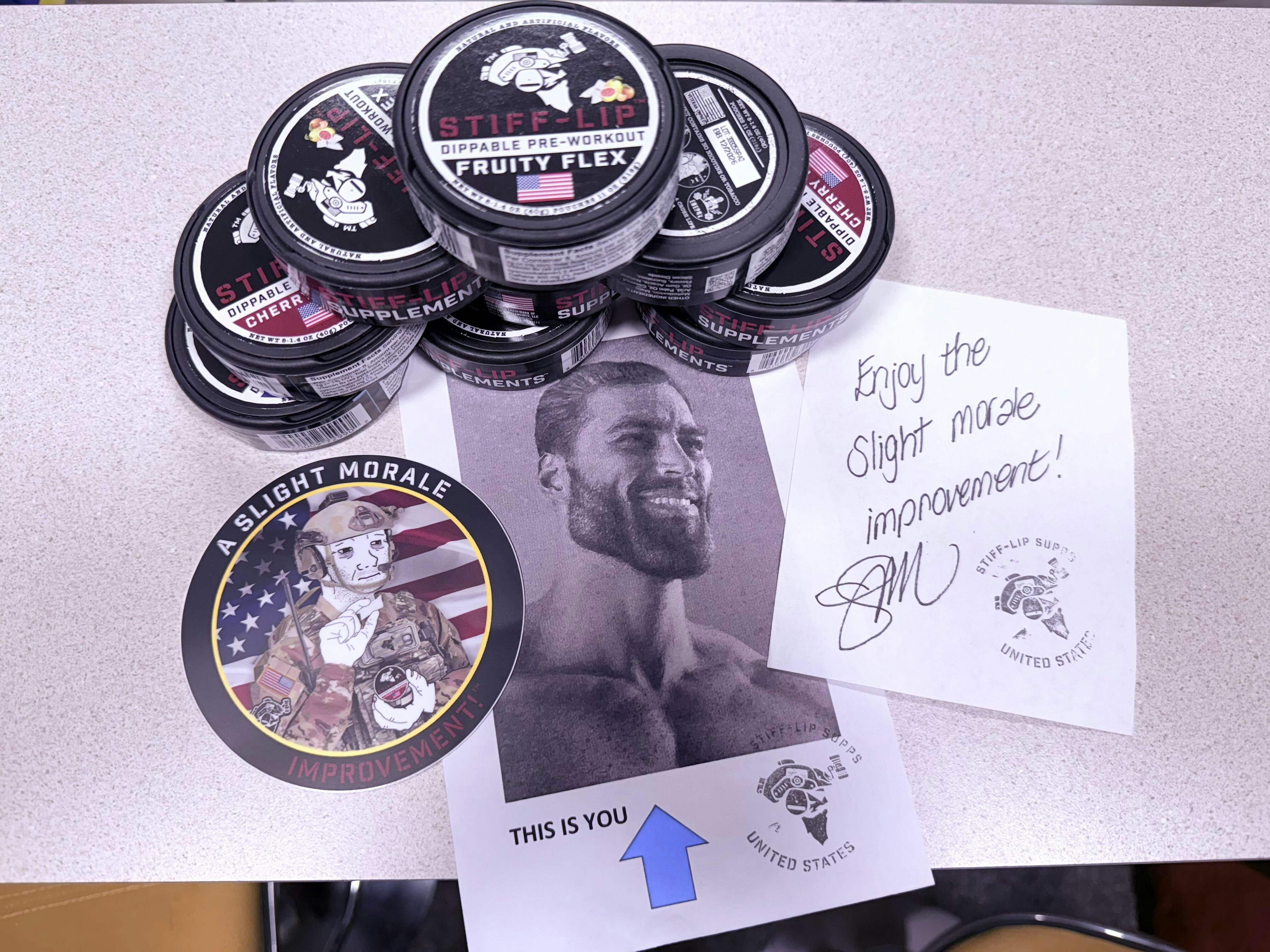 Stiff Lip Supplements was built and founded from a Firebase in Syria. Since then, we have been working diligently to caffeinate as many Hardworking Americans as possible. Thank you for allowing us to accomplish that Mission.